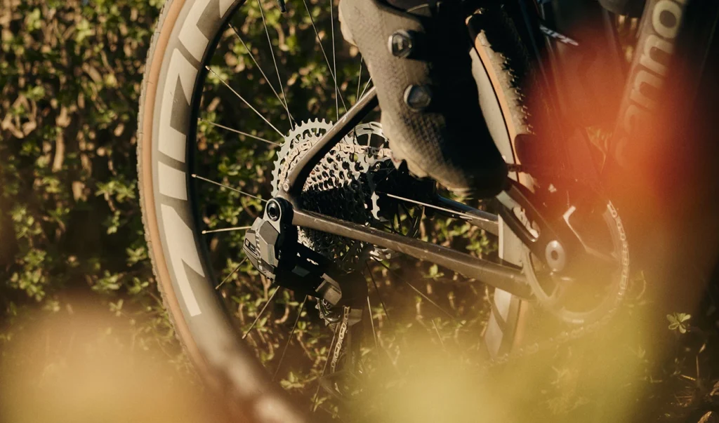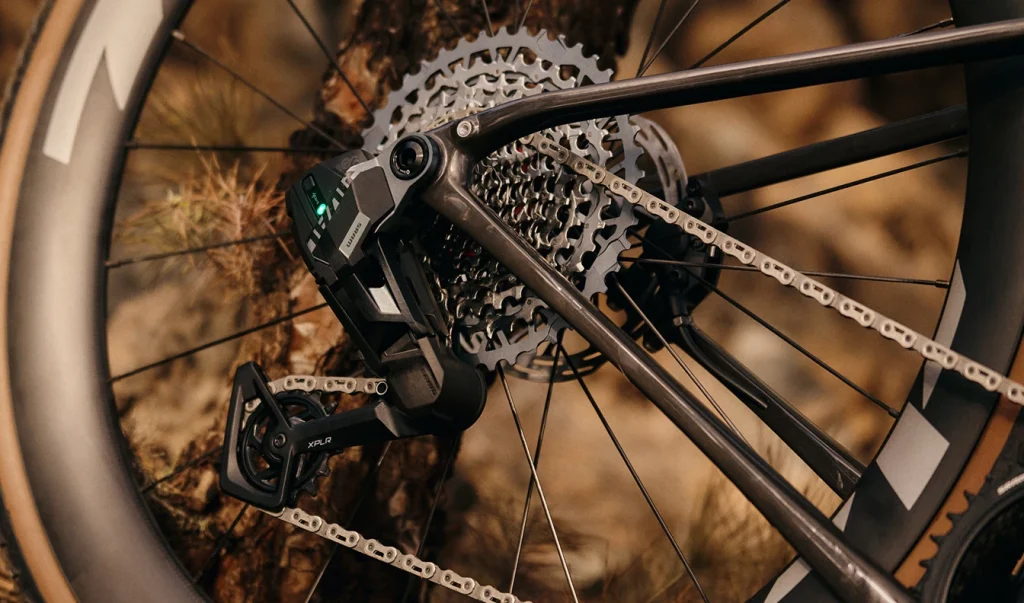 El cambio Rival XPLR AXS con tensor inspirado en los modelos de MTB, mantiene tu cadena engranada con firmeza y suavidad en cualquier circunstancia.